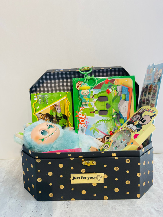 این هدیه شامل عروسک لبوبو،استیکر،اویز کلید،دو عدد لگو با طرح لبوبو و ناخن مصنوعی هست